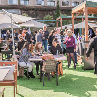 Todos os participantes receberam uma taça e um “colar” porta-taça para que pudessem circular e desfrutar da gastronomia servida em uma bancada de réchauds, ou ainda se acomodar em grupos nas mesas e espaços de descanso instalados no local.